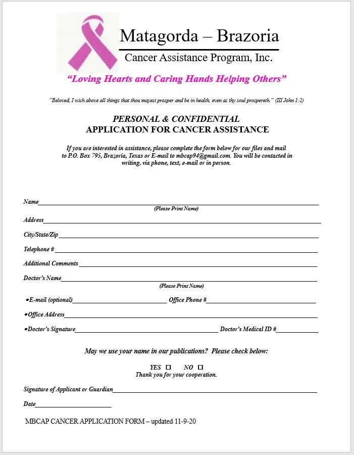 If you are interested in assistance, please complete the form below for our files and return to your Pastor, any member of MBCAP, or mail/e-mail to the addresses on top for the form. You will be contacted in writing, via phone, text, e-mail or in person.